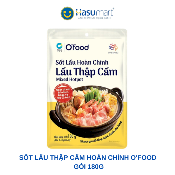 Sốt lẩu thập cẩm hoàn chỉnh O'Food gói 180g được làm từ sự hòa quyện và phối trộn giữa nhiều nguyên liệu và gia vị như hành tây, sả, cà chua, gừng, nước mắm, đường, chiết xuất bắp, nấm hương, tiêu,...tổng thể tạo nên nước cốt đậm đặc, mang đến hương vị mặn ngọt tự nhiên.